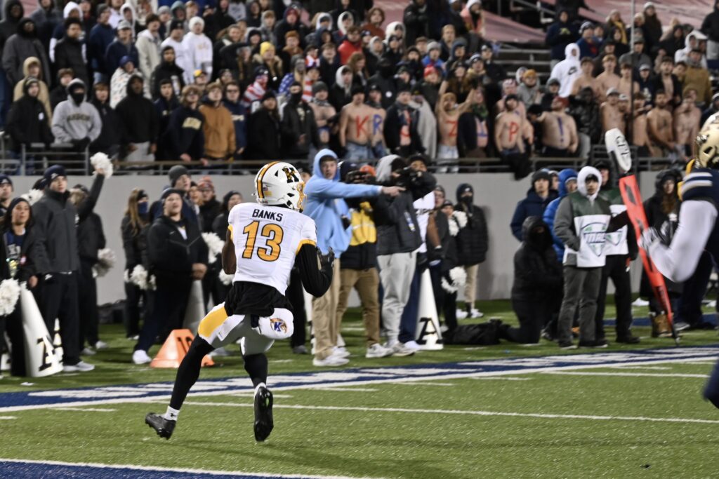 I had a chance to watch Ardell Banks from the sideline last week. He pulled in a pair of passes for 28 yards, but his second reception was quite the play. The Flashes had blown a 35-17 lead to Akron and were in overtime. On the first play of the overtime, Kent State quarterback Dru DeShields fired a pass to the right sideline where it was caught by Ardell Banks, who managed to keep his feet inbounds for the go-ahead (and ultimately game-winning) score.