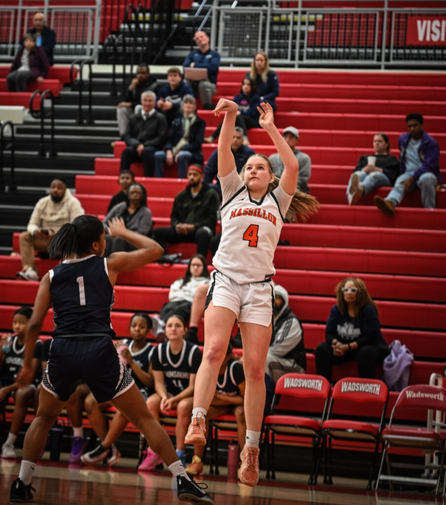 The contest between the Tigers of Massillon and the Tigers of Twinsburg was a low-scoring affair for the first few minutes. Missed shots on both ends led to a score of 7-4 in favor of Massillon halfway through the quarter as Rylee Adams knocked down a 3 to break the tie. Twinsburg put together a run, outscoring Massillon 12-5 in the remainder of the quarter to take a 16-12 lead. Delaney Pierce hit a jumper to cut the deficit to 2, but once again misses both ways led to a long scoreless stretch. Twinsburg finally broke the streak with a pair of free throws and added a bucket to take a 20-14 lead. At the 3:00 mark of the 2nd quarter, Massillon trailed by 10. Pierce was the first to respark the Tigers on the offensive side as she drilled a 3. Hannah Nicola stole the ball and took it all the way for 2. Twinsburg scored, but Jaryn Wolff hit a huge 3 to cut the lead to 23-27. Twinsburg had the last shot of the half but missed, and the Tigers only trailed by 4 after 2.