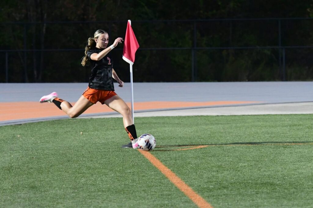 Retaining players is a challenge for the Tigers. “It is incredibly unheard of to have a varsity team that has juniors and seniors walk on for soccer, and we get that all the time,” says Coach Sebrell. Many teams around the Tigers have squads who have played together for years, and players who have played soccer since they were 3 or 4 years old. “That’s not the case for us,” she told me. “It can be incredibly trying for a not only a young player like Lucy that is a freshman, but also to have a player that is as skilled as Lu that has to figure out how to navigate a field of players. These next couple years we’re going to be rebuilding again as we lose multiple seniors including both of our captains. Having those retaining structures in place help us continue on with what we’ve been doing. I think that comes back to the respectability and then us gaining some wins and people saying, ‘Hey, there is stuff going on here.’ These girls are trying, and I think that once you see us in action, you see how hard these girls are working and how physical it is. You’ll see my girls out there that are not willing to come off the field because they are such athletes like Kynslie Williams. She’s out there playing all wrapped up and my keepers are just jumping at the bit to stay in. These girls are tough. Hannah is a beast in whatever she does. They don’t come out–they get knocked down and they get back up and off we go again.”