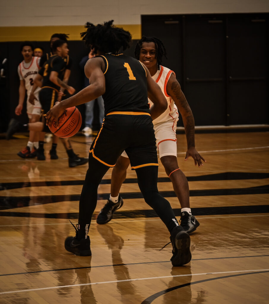 Jadyce Thigpen is all smiles as he guards Euclid’s Demetrius Jenkins. Photo: Seth Bailey