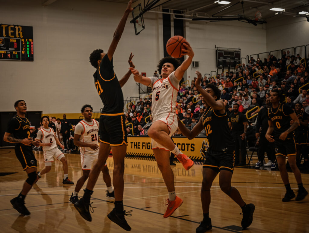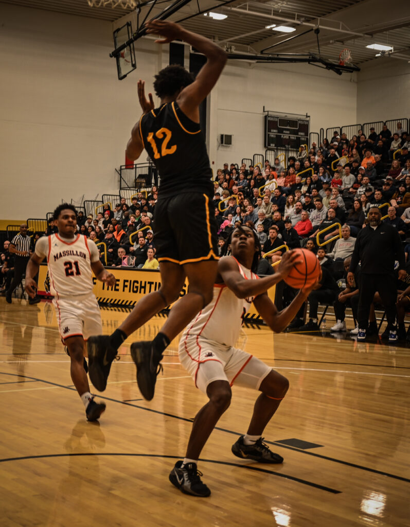 Braylon Gamble, the Massillon scoring leader (20 points), takes it through a pair of defenders and to the basket. Photo: Seth Bailey