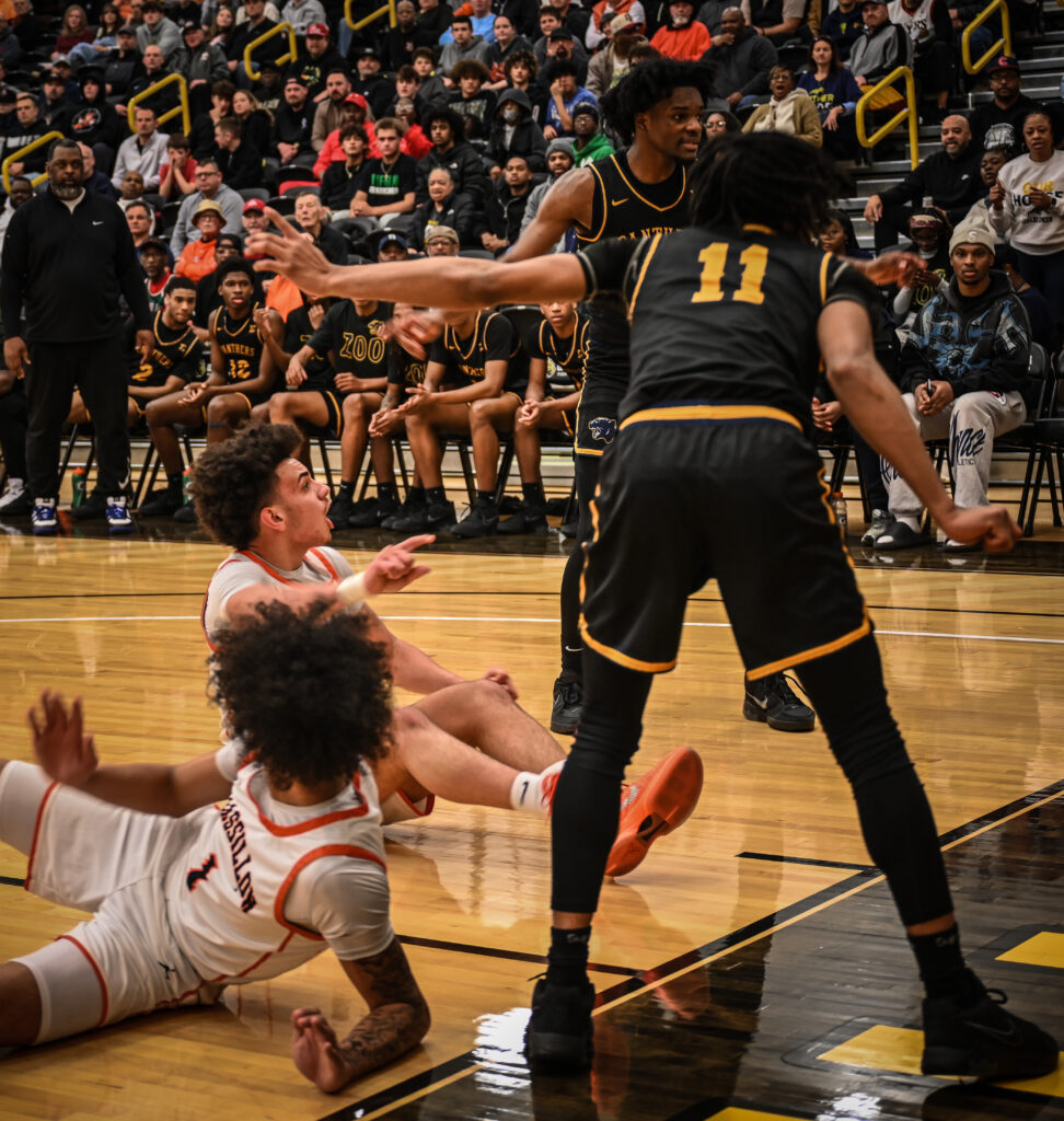 Which way? Tigers and Panthers both protest an out of bounds call. Photo: Seth Bailey